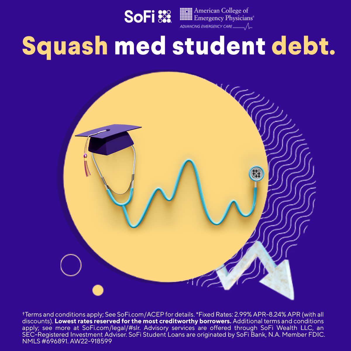 Give your finances a big-time boost by refinancing your student loans with SoFi. You'll get access to a rate discount of 0.25% as a member of ACEP, along with exclusive low fixed rates starting at 3.99% APR 2.99% APR* (with all discounts) for doctors with loan balances over $150K.