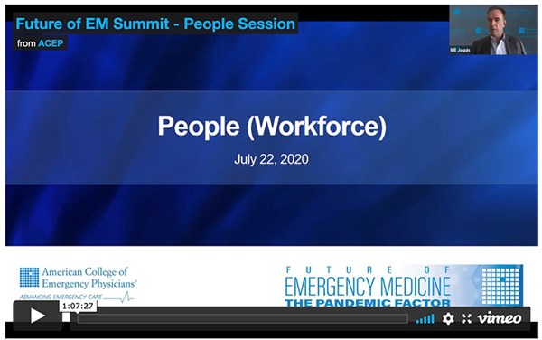 In the late summer of 2020, amid the Sars CoV 2 pandemic, then-ACEP President William P. Jaquis convened a series of summits to examine the forces that influence our practice, and the potential future changes to our specialty. A small group of thought leaders provided the initial construct of the summits, breaking them into four domains – patients, people (workforce), practice, and payment, recognizing that none of these domains are independent of the others. From that framework, four summits (virtual) were held with leaders in those domains along with a small invited audience of experts to discuss and reflect on each presentation.