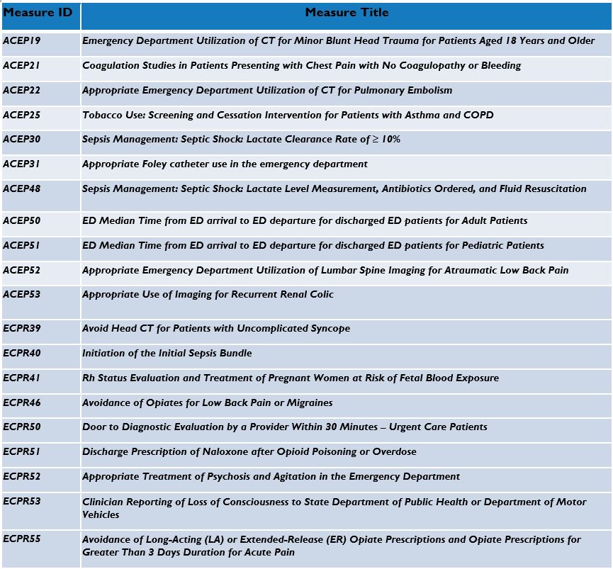 CEDR currently has 16 ACEP (11 continued and 5 new) measures, 9 ECPR (Vituity) measures and 21 QPP measures under the Quality category for Emergency Medicine. All continuous and new measures go through an annual approval through the Self-Nomination Application process developed by CMS.