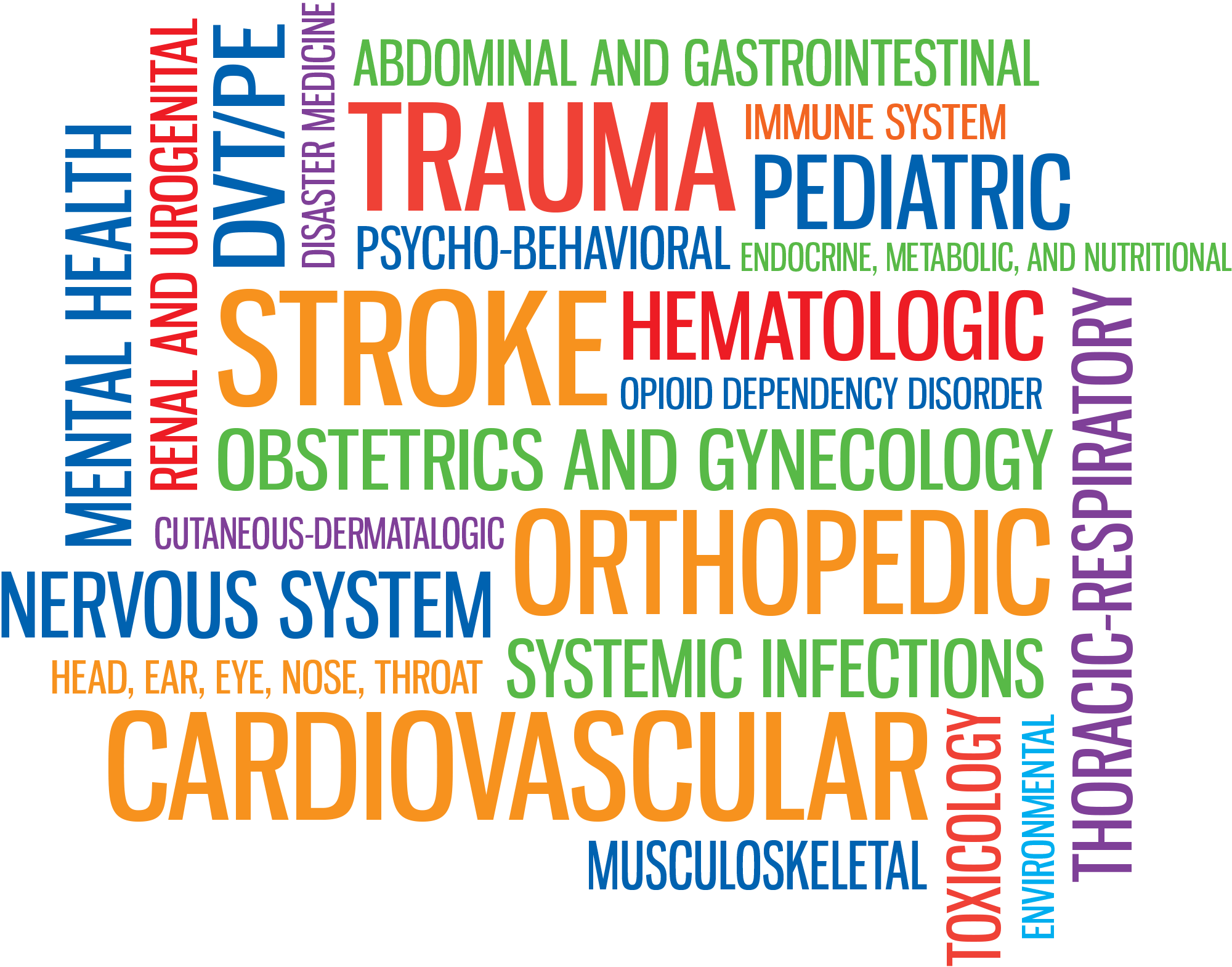 Emergency physicians treat patients with symptoms in these clinical areas:
