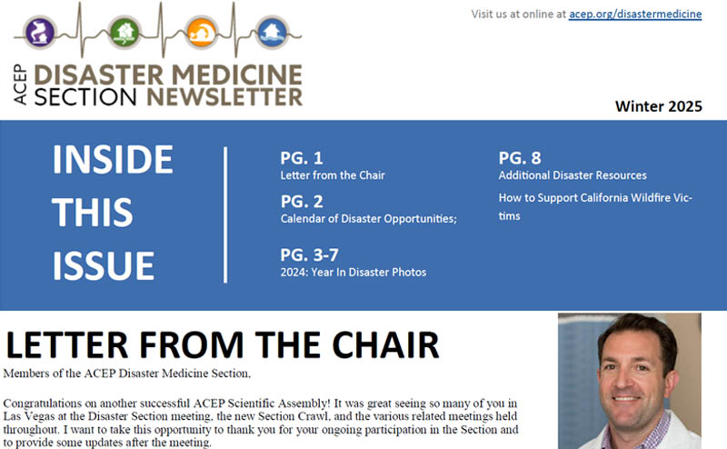 Congratulations on another successful ACEP Scientific Assembly! It was great seeing so many of you in Las Vegas at the Disaster Section meeting, the new Section Crawl, and the various related meetings held throughout. I want to take this opportunity to thank you for your ongoing participation in the Section and to provide some updates after the meeting. Click here to read more and view our Winter E-Newsletter.