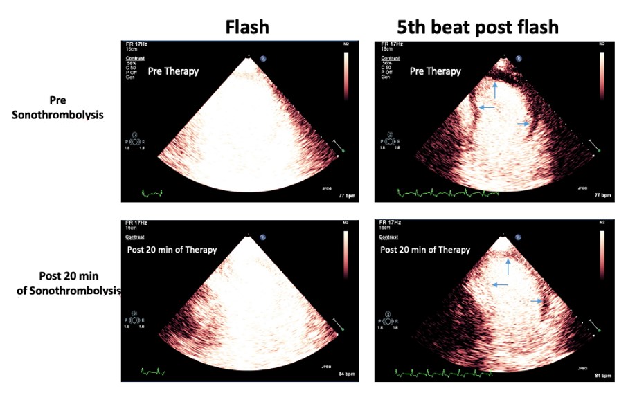 Emergent percutaneous interventions (PCI) have revolutionized the care for patients with acute occlusive myocardial infarction and have been the treatment standard for decades. While PCIs have significantly improved the prognosis of patients with acute ST-segment elevation myocardial infarction (STEMI), significant microvascular obstruction (MVO) can still be shown in over half the patients undergoing emergent intervention, leading to persistent cardiac dysfunction.1 Sonothrombolysis using an ultrasound contrast agent (UCA) may benefit these patients by dissolving microvascular thrombi and improving coronary artery flow by nitric oxide (NO) release.2