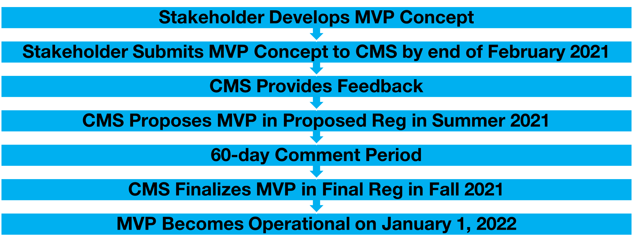 CMS doesn’t expect this significant transition from MIPS to MVPs to APms to happen overnight. In fact, CMS’ initial timeline for implementing the first set of MVPs has been delayed from 2021 to 2022 due to the COVID-19 pandemic. CMS expects to have a few MVPs operational in 2022 and then add more each year thereafter. With respect to the process for developing new MVPs, CMS is relying on outside stakeholders (like ACEP) to submit MVP concepts. Once submitted, CMS will go back and forth with the submitter on the proposal and may make changes to specific measures or other features of the MVP. After these initial conversations, CMS will take ownership of the MVP and decide whether to propose it in the annual Physician Fee Schedule (PFS) and Quality Payment Program (QPP) proposed regulation. If CMS does decide to propose the MVP concept, like any other proposal in this annual reg, the public will have a chance to comment on it and then CMS will ultimately decide whether to finalize the MVP in the final reg.