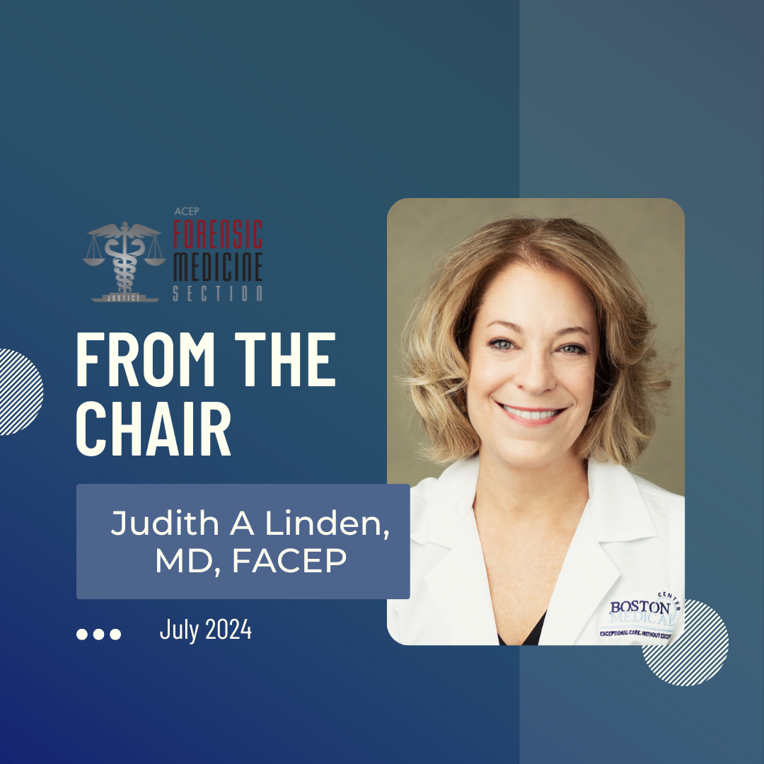 I hope you are enjoying your summer so far – both the lazy days of summer, and the crazy days of July in the ED. In this newsletter, I would like to update you about this year’s Forensic Section’s accomplishments and offerings. Our section aims to bring you the latest developments and current events in the field of forensic medicine. As always, we strive to provide you with valuable information and insights that can enhance your knowledge and practice, as well as provide a forum for connecting and sharing with members who have similar professional interests.