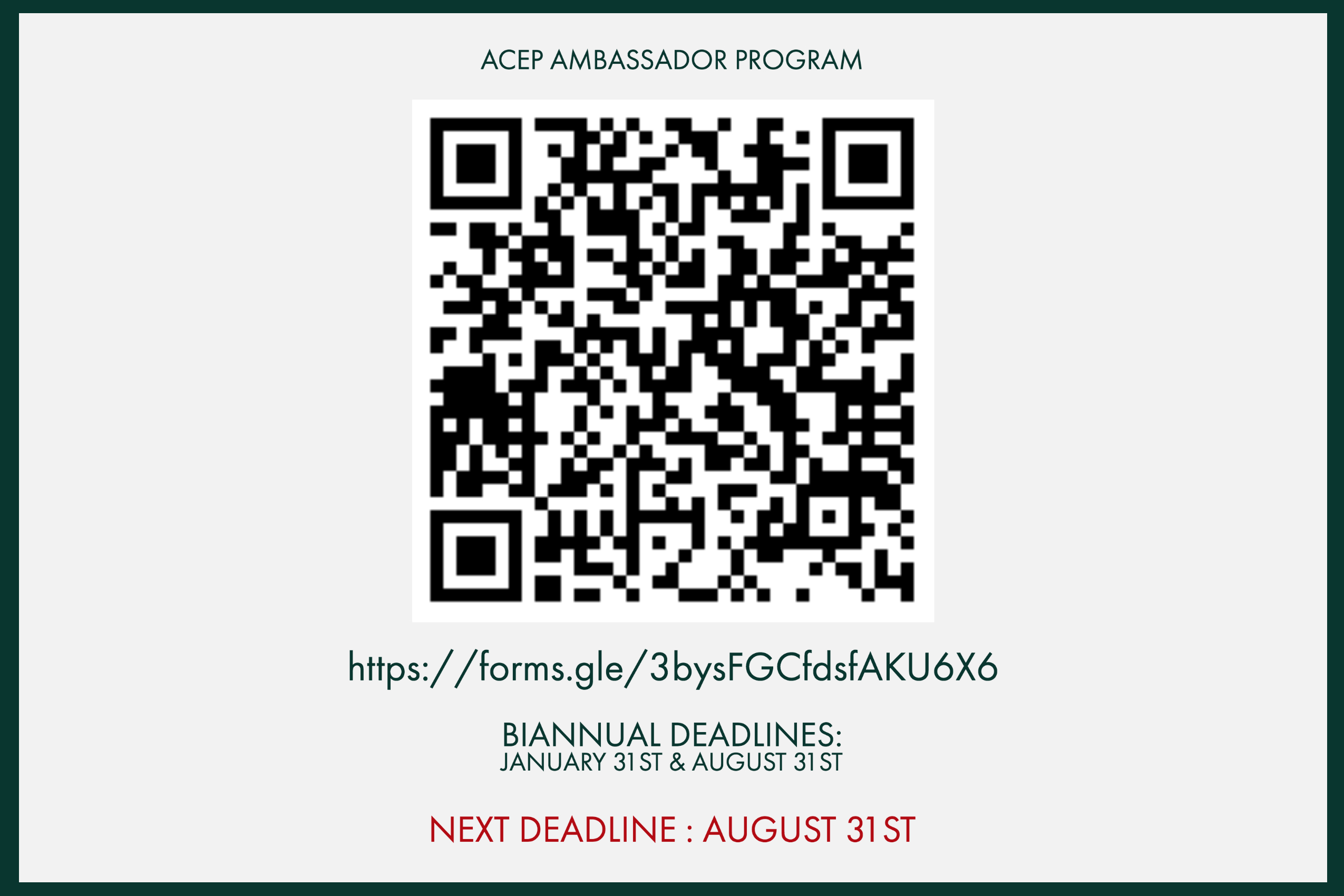 The Ambassador Program Recruitment Committee is pleased to announce that we will be amending our application process for the ACEP Ambassador Program. In the past, the applications to apply for positions within the program (e.g., Ambassador, Liaison, or Representative) have been accepted on a rolling basis. We will be amending the application process to include biannual deadlines to allow for a more expedited review of applications and induction of officer roles and responsibilities. The biannual deadlines for the applications are as follows: