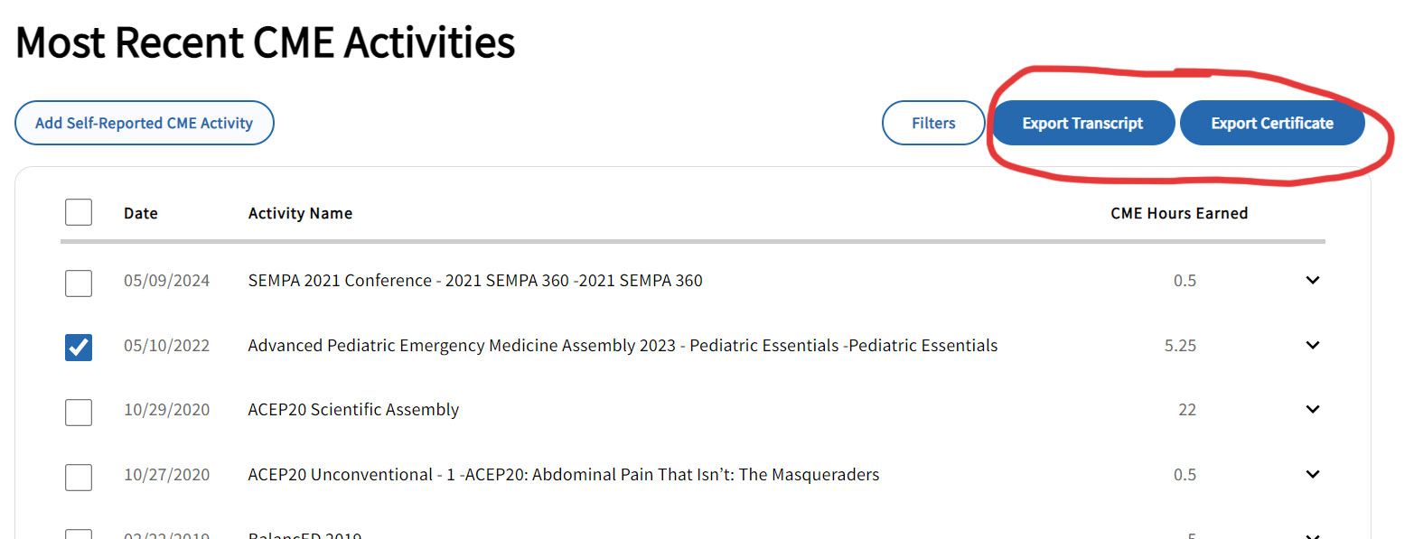 - From the "Unclaimed CME Hours" page, select "Get Transcript" at the top right.