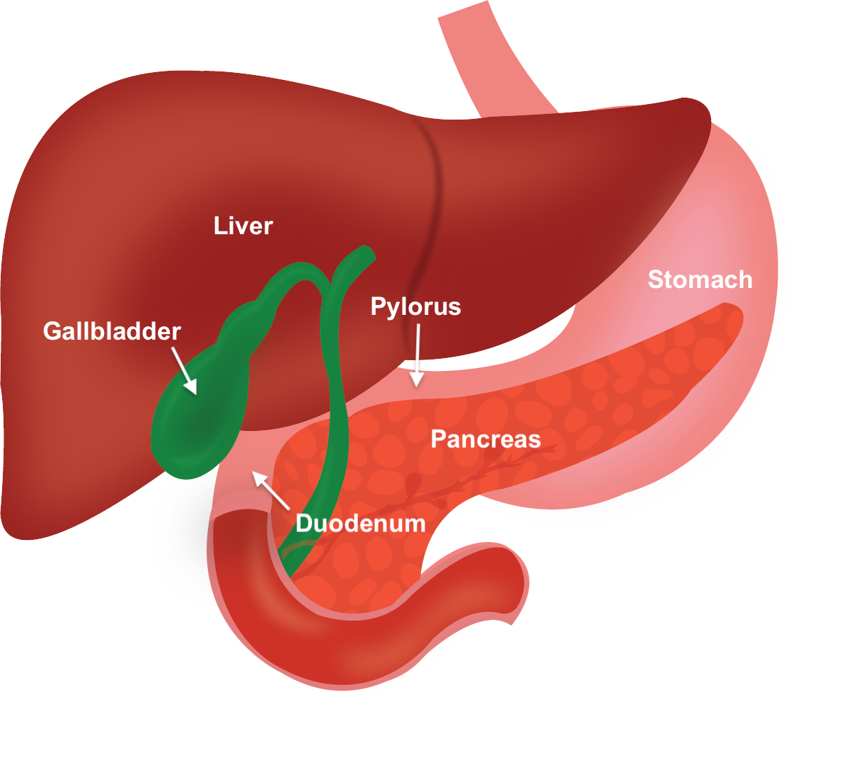 - Find the gallbladder adjacent to the liver and look medially to locate the pylorus.
