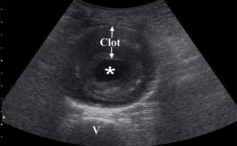 - Figure 9. Transverse view of a 7 cm AAA with intraluminal clot (* on the lumen, “v” denotes vertebral body)