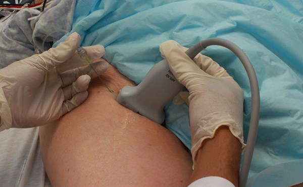 - If the tip is not clear, inject 0.5 cc of local anesthetic. This will deform the tissue surrounding the tip, and the anechoic fluid bolus should highlight the tip.