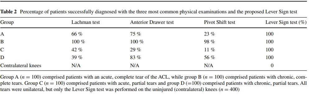 A 2014 Italian prospective study1 by Lelli et. al recruited 400 patients with confirmed ACL ruptures on MRI in order to evaluate the new ACL physical examination maneuver they created. They appropriately excluded cartilage defects, multi-ligamentous injuries, meniscal injuries, and prior reconstructions of the affected ACL. The patients were equally split into 4 groups based on two factors: 1. complete vs. partial ACL lesion and 2. acute vs. chronic. The study then blinded 1 physician (unclear if it was Dr. Lelli) to the MRI results who performed the Lever Sign, Lachman, Anterior Drawer, and Pivot Shift tests on everyone. The uninjured leg was used as a control. The results were suspiciously positive with 100% sensitivity and 100% specificity. The closest sensitivity was 72% for the Anterior Drawer. See the table below for a summary of comparative accuracies of the different tests1.