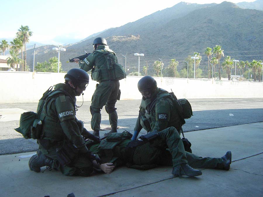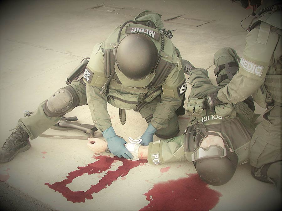 Law enforcement specialized tactical teams often deploy to high-risk, large-scale, and extended operations and under conditions that place hostages, bystanders, police officers, and suspects at increased risk for injury or illness. The risk profile calls for incorporating a medical element into all phases of these operations. In addition to rendering immediate medical care, properly trained medical providers assigned to law enforcement teams are able to assist commanders with developing pre-deployment medical risk assessment, implementing risk reduction strategies, providing logistic support, and serve as a liaison to coordinate medical operations with local emergency medical services (EMS).