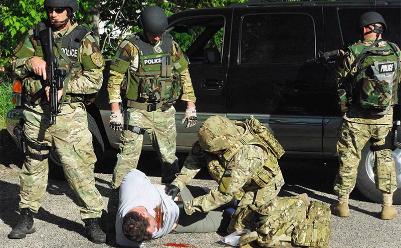This realistic scenario-based training involves TECC (tactical emergency casualty care) for a downed suspect. After shooting at officers, he was neutralized, secured, cuffed, searched, and now the TMP (tactical medical provider) is performing a tactical patient assessment. Treatment of a GSW to the chest is limited in the field, and rapid extraction and casualty evacuation/transport is the critical next step. This is a load and go situation, and an accompanying armed officer will go in the vehicle with this suspect and the TMP(s) to the most appropriate hospital. Photo by Dr. John Wipfler.