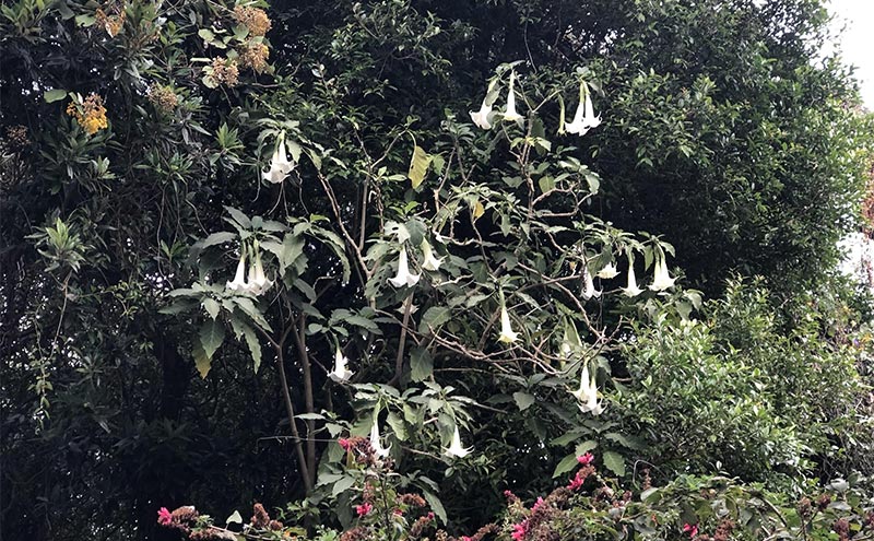 Angel’s trumpet contains a large amount of belladonna alkaloids, also known as parasympatholytics. The belladonna alkaloids include atropine, hyoscyamine, and scopolamine. Scopolamine is specifically nicknamed “Devil’s Breath” due to its use by robbers in Columbia to incapacitate their victims (9).