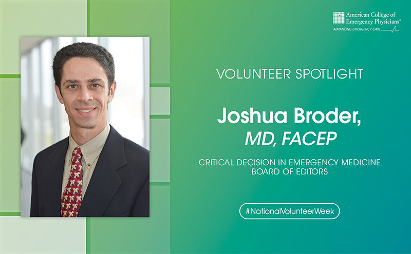 Joshua S. Broder, MD, FACEP, is a member of the Board of Editors for Critical Decisions in Emergency Medicine and has contributed a feature article called The Critical Image to Critical Decisions every month since January 2007 – more than 200 feature articles. His contribution to the education of emergency physicians through Critical Decisions has contributed to the publication’s growth and popularity for nearly two decades. Editors and fellow volunteers who work on the publication say he is diligent in providing the most well-crafted articles to provide the best opportunity for emergency physicians to learn.