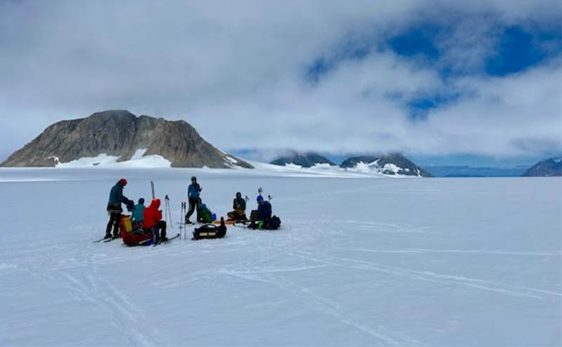 (photo: Teams Safety Meeting on the Juneau Icefield. Credit: Marc Cassone)